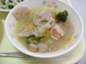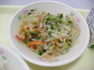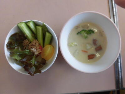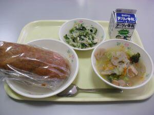 今日の献立は【揚げパン・ポトフ・チキンサラダ】でした。今回は給食時間の放送内容を紹介します。『今日は人気の揚げパンです。みなさんは揚げパンの作り方を知っていますか?パン屋さんから届いたコッペパンを給食室で高温の油で揚げます。そして、きな粉砂糖を1個1個丁寧にまぶしています。教室では一人ひとりが食べやすいようにビニール袋に入れて、上手に食べてください。』でした。それでは本日の綾町食材の生産者の方々を紹介します。千切り大根が古屋地区の石神さん、きゅうりが四枝地区の清水さんでした。今日も美味しい食材・美味しい調理ありがとうございました。
