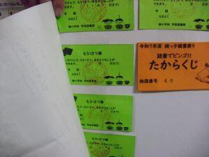 今日は【あやっ子】が楽しみにしている【読書宝くじ】の日でした。子どもたちは、ワクワクしながら読書ビンゴで集めた宝くじ引換券を持って、図書室前の廊下に並んでいました。読書が楽しみになる【あやっ子(図書委員会)】のイベントでした。