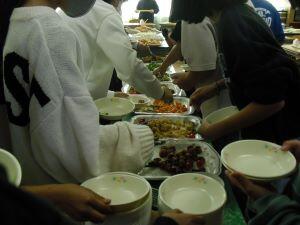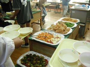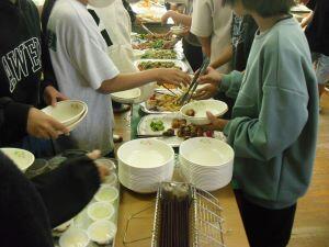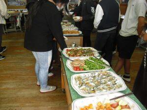 今日6年生は【卒業バイキング給食】でした。みんなワクワクしながら、大きなお皿に盛られた料理を自分のお皿に取り分けていました。笑顔いっぱいのバイキング給食でした。