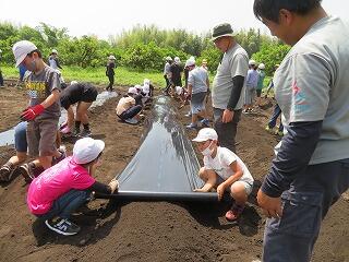 JA綾町の青年部の方に教わりながらマルチを張りました。