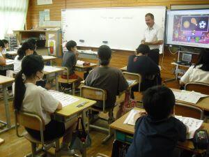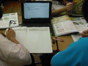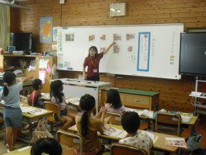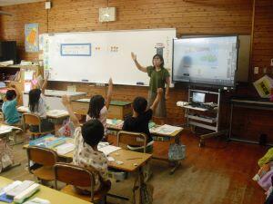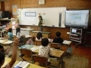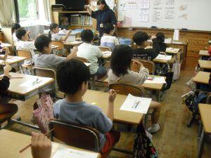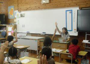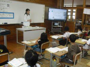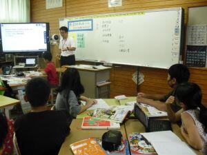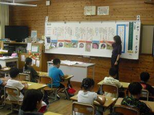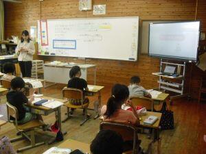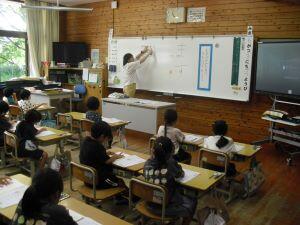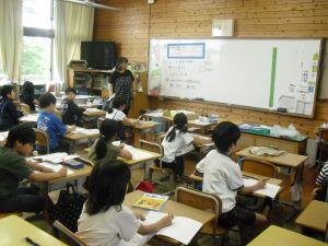 今日1年生は国語、4年生は算数、5年生は外国語の学習がありました。1年生は「やくそく」という教材の音読発表会の準備をしていました。グループをつくり、自分たちで話し合って音読の分担をする1年生でした。4年生は算数の学習で、割り算の式が違っても商が同じになる理由を考えていました。30÷10=3ですが、5円玉の集まりだったらどうなる?という先生からの問いに(30÷5)÷(10÷5)=3という考えをノートに書く4年生でした。5年生は外国語の学習でHeとSheを使い分けて、会話する練習をしていました。ペアになって問う側と応える側を交代で練習する5年生でした。