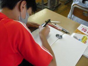 今日1年生は、書写の学習がありました。「ま」や「す」のひらがなを「結びのかたちに気を付けて」書く練習をしていました。結びのかたちを「ま」の場合は「お魚」、「す」の場合は「おむすびの横」というようにイメージしながら集中して練習する1年生の【あやっ子】でした。