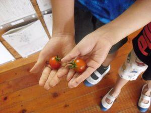 今日2年生は、生活科の学習で育てている野菜の収穫をしました。スクスクと成長して、とても美味しそうな「なすび」と「ピーマン」「トマト」でした。