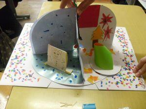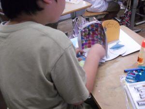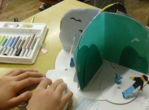 今日3年生は、図工の学習で、「割りピンワールド」の作品を仕上げていました。割りピンを使ってテーブルが回転する作品で、回転することで変わる四つの場面をそれぞれが楽しそうに表現していました。