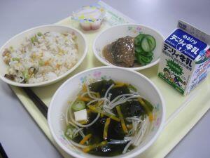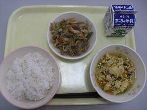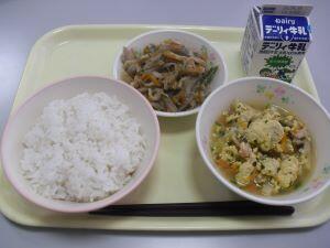 昨日20日(木)の給食献立は【鶏ごぼうご飯・魚そうめん汁・まごはやさしいひじきの煮物・冷凍ミカン】でした。今回は、給食時間中の放送でアナウンスされた内容を紹介します。『毎年一度は出している、「まごはやさしいひじきの煮物」です。もちろん「まごはやさしい」は語呂合わせです。何だったか、覚えていますか?「ま」は「まめ」、「ご」は「ごま」、「わ」は「わかめ」で海藻のことです。「や」は「やさい」、「さ」は「さかな」、「し」は「しいたけ」、「い」は「いも」です。これらを取り入れると栄養バランスのとれた献立になります。しっかり食べてほしいです。』 ※栄養バランスとのとれた美味しい給食いつもありがとうございます。