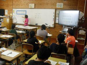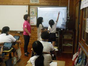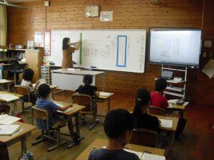 今日4年生と5年生は算数の学習がありました。4年生は2桁÷2桁の筆算の仕方を学ぶために、まず、電子黒板の絵図を使って視覚的に割り算をした後、この時間の「めあて」を自分たちで考え発表していました。5年生は紙を折った回数と長方形の数の関係について表にまとめた後、長方形の数が2・4・8・16と2倍になって増えているという決まりを見つけていました。順に増える数を表を使って調べる5年生でした。
