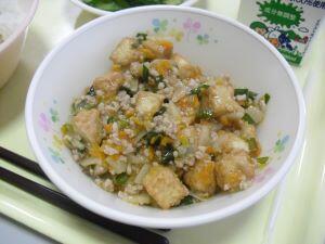 今日の献立は【麦ご飯・マーボー厚揚げ・揚げ餃子・添えきゅうり】でした。「マーボー厚揚げ」は甘辛くご飯がすすむ味付けでした。「揚げ餃子」はニラの入ったあんが美味しく、皮が「カラッ」と揚がっていました。そして、「添えきゅうり」でさっぱりしました。今日も美味しい給食ありがとうございました。それでは、ふるさと【綾】産食材の生産者の方々を紹介します。米は揚町地区のJA綾町さん、きゅうりは麓地区の安永さん、ニラは中堂地区のほとくり会さんです。生産者の皆さん、調理員の皆さん、給食に関わる全ての方々、今日も美味しい食材、美味しい調理ありがとうございます。今週もどうぞよろしくお願いいたします。