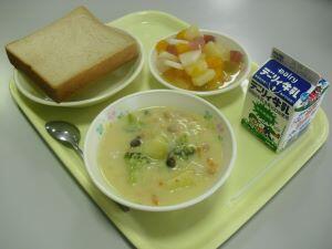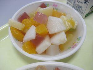 今日の献立は【黒糖食パン・豆乳クリームシチュー・フルーツカクテル】でした。今回は給食時間に流れた放送内容を紹介します。『今日のフルーツカクテルには、季節のフルーツ「梨」が入っています。この梨は、綾町の中島さんが作ったもので「秋月」という品種です。綾町内では他に季節をずらして「二十一世紀」「豊水」「新高」などができるそうです。今日は全校で23個の梨を使っています。みずみずしい新鮮な梨を味わっていただきましょう。』今日も美味しい給食ありがとうございました。