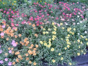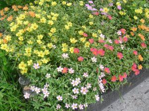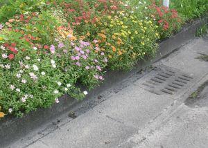 「人権の花」運動で贈呈された苗がきれいに花を咲かせています。同じく贈呈された看板のとなりで色とりどりの花々です。