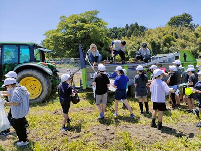 まずは堆肥まき。堆肥の匂いを感じながらまきました。子どもたちが時間をかけてまいた後は機械でいっきにまきました。機械のすごさを感じる場面がこれからもたくさん出てくると思います。