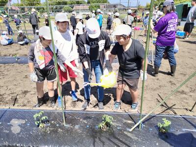 続けて野菜の苗植え。今年はオクラ、ズッキーニ、トマト、ナス、ピーマン、ゴーヤ、キュウリの7種類を育てます。マルチを貼るところまで青年部の方にしていただいたので植えるだけでしたが、これからしっかりお世話をしてもらいたいと思います。