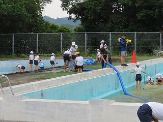 途中で雨も降ってきましたが、子どもたちは雨にも負けず一生懸命に掃除をしてくれました。きれいになったプールで早く水泳の授業がしたいです。