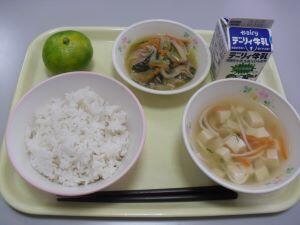 11月1日の給食は、麦ご飯、ワンタンスープ、厚揚げの甘辛煮、牛乳です。