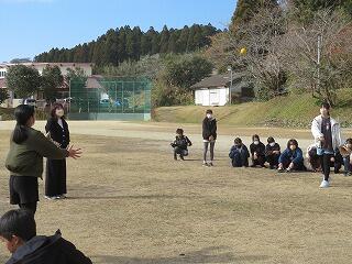 学年みんなで運動場に出て、キャッチボールをして楽しみました。
