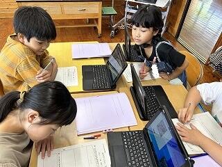 タブレットを使って調査活動をふり返りながら、一生懸命話し合っていました。