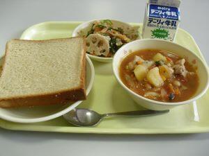 今日の給食の献立は、【黒糖しょくパン・まめと鶏肉のトマト煮・れんこんごまサラダ】でした。食材のにんじん・たまねぎ・しめじ・じゃがいも、きゅうりは、全て「ふるさと綾産」です。そして今日は『カミカミ献立』でよくかんで食べることのできる食材が選んで調理されています。よくかんで食べると唾液が出て消化吸収がよくなり食べ物の味がよくわかります。そして、かむことによって脳を刺激することができ、あごや歯を丈夫にしてくれます。栄養のバランスだけでなく、脳やあご・歯の働きまで考えたおいしい給食ありがとうございます。