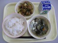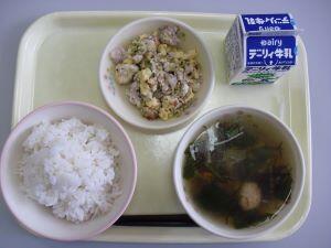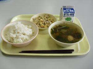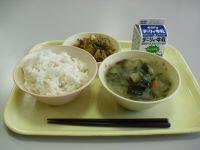 今日の給食!!【むぎごはん・もずくスープ・ゴーヤチャンプル】