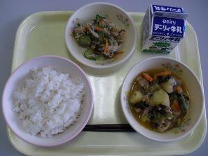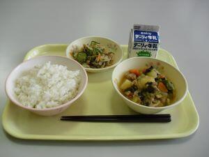 今日の給食の献立は、【むぎごはん・キムチーズ肉じゃが・千切り大根の酢の物】でした。食材の米はJA綾町、じゃがいも・にんじん・玉ねぎ・千切り大根・きゅうりは全て「ふるさと綾産」です。キムチーズ肉じゃがは、食欲が落ちそうなこの時期にピリッとした辛味で食欲を高め、辛い物が苦手な子どもたちにもチーズを入れることでまろやかさを出しています。千切り大根の酢の物との相性もよく、バランスのとれたとても美味しい給食でした。今日も、おいしい給食ありがとうございます。