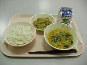 今日の献立は【ビビンバ・五目豆腐スープ】でした。今回は給食時間の放送内容を紹介します。『ビビンバは韓国料理です。ビビンバの名前の由来は韓国語で「ビビム」が「混ぜ」、「パプ」が「ご飯」これを合わせた言葉です。韓国でも野菜たっぷりで栄養バランスのとれた家庭料理として親しまれているそうです。ご飯に具をのせ、混ぜ合わせて食べると美味しいですよ。』でした。ビビンバ・五目スープ共にとても美味しく大満足でした。今日も美味しい給食ありがとうございます。それでは本日の綾町食材の生産者の方々を紹介します。米が有機米でアヤオーガニックワークスさん、にんじんが久木野地区の郡さん、ほうれんそうが割付地区の福重さんでした。今日も美味しい食材・美味しい調理ありがとうございました。