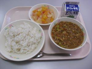 今日の献立は【キーマカレー・フルーツジュレ】でした。今回は給食時間の放送内容を紹介します。『今日はキーマカレーです。キーマカレーとは、インド発祥のひき肉を主役にしたカレーのことです。「キーマ」とは、インドの言葉で「細かいもの」とう意味です。細かく刻んだ野菜とひき肉を炒めて、スパイスと煮込んで作る汁気が少ないカレーです。じゃがいもも、細長く切って、食べやすくしています。よく噛んでいただきましょう。』でした。とても美味しいキーマカレーありがとうございます。それでは本日の綾町食材の生産者の方々を紹介します。米が有機米でアヤオーガニックワークスさん、エリンギが古屋地区の宮崎産業さん、にんじんが久木野地区の郡さん、じゃがいもが揚町地区の西郷さんでした。今日も美味しい食材・美味しい調理ありがとうございました。