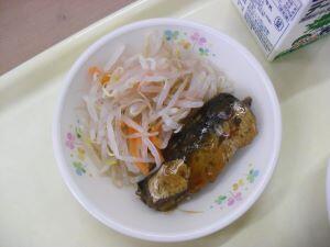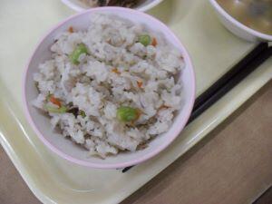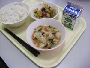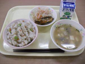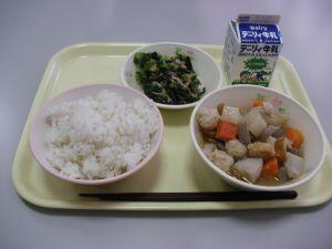 今日の献立は【舞茸ご飯・五目味噌汁・イワシの梅煮・添えもやし】でした。今回は給食時間の放送内容を紹介します。『今日の舞茸ご飯は島根県の郷土料理です。郷土料理とは、その土地でたくさんとれるものを使って作られる料理のことです。舞茸の名前の由来は、重なり合って踊りを舞っている姿に見えるところから舞茸という名前になったという説や、松茸よりおいしいと言われる舞茸を見つけた人が、あまりの嬉しさに踊りを舞いだすことから舞茸と言われるようになったなどの説があります。シャキシャキとした歯切れの良さが人気のきのこです。味わっていただきましょう。』でした。それでは本日の綾町食材の生産者の方々を紹介します。こんにゃくが宮原地区の大山食品さんでした。今日も美味しい食材・美味しい調理ありがとうございました。
