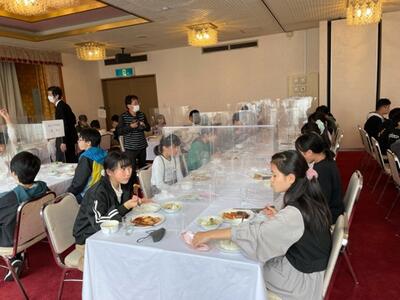 修学旅行最後の食事となる昼食をいただきました。ハンバーグと唐揚げをフォークとナイフを使っていただきました。