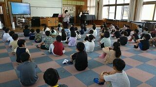 学年集会での様子です。先生の質問にもよく反応していた子どもたちです。先生の話をしっかりと聞いていますね。