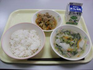 今日の献立は【麦ご飯・芋煮・千切り大根の卵とじ】でした。今日は、毎月16日の「ひむかの日」で宮崎県内や綾町の食材たっぷりの献立ですので、給食時間に放送された放送原稿を紹介します。『今日は、毎月16日の「ひむかの日」です。今日の綾産の食品は、米(揚町地区のJA綾町さんの綾産有機米)・綾ぶどう豚(揚町地区のAコープ綾さん)・にんじん(久木野地区の郡さん)・長ネギ(尾立地区のオーガニック綾さん)・千切り大根(揚町地区のJA綾町さん)・こんにゃく(宮原地区の大山食品さん)・しめじ(古屋地区の宮崎産業さん)・小松菜(割付地区の福重さん)です。どれも、新鮮な収穫したものを、朝、ほんものセンターさんなどの業者さんを通して、小学校に届けてもらいます。新鮮ということは、色も鮮やかで、栄養たっぷりです。旬の食材をおいしくいただきましょう。芋煮は、山形県をはじめ東北地方の寒い地方で食べられる料理です。食べて体を温めましょう。』でした。今日も美味しい食材・美味しい調理ありがとうございました。