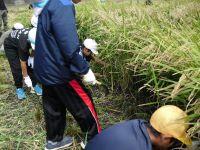 本日5年生は、総合的な学習の時間に「稲刈り」を行いました。5年生が作成した看板をバックに、記念写真撮影も行いました。その後、機械を使って稲を刈りました。そして、残りの稲を5年生のあやっ子が、鎌を持って手刈りしました。作業が進むごとに、手刈りの手つきがよくなる5年生でした。刈り取った後に、落ちている稲穂も拾い、コンバインに運ぶ作業も行いました。このような貴重な体験ができるのも、土地を貸して頂いた地域の方々、多大なる御支援とご協力を頂いたJA綾町・JA綾町青年部の方々のおかげです。心より御礼申し上げます。本当にありがとうございました。これからも、あやっ子をどうぞよろしくお願いいたします。