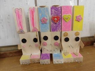 丸や星形など決まった板のパーツを組み合わせて形にしていきますが、どこに釘を打つかも一人一人違っており、思い思いの作品ができました。とてもかわいらしいですね。