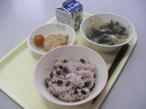 12日(金)は入学式が行われ、給食は【入学・進級お祝い献立(赤飯・お祝いすまし汁・鶏肉の香草パン粉焼き・ミニトマト)】でした。この日に流れた給食時間の放送内容を紹介します。『今日は入学・進級お祝い献立です。新しい学年にはもう慣れましたか?赤飯はお祝い事には欠かせない料理の一つです。赤飯に使われている小豆は、日本では古くから悪いものをはらうと言われ、お祝いの時に赤飯を炊く食習慣が始まりました。皆さんがこれから1年間、健康で元気に学校生活が送れるよう、給食室の先生方が愛情込めて作ってくださいました。赤飯はなかなか食べる機会がなく、食べなれない人も多いと思いますが、お祝いの料理なので残さず食べてくれると嬉しいです。入学、そして進級おめでとうございます。』