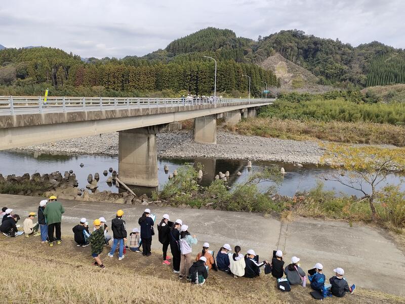 理科の授業で川の観察に行きました。橋の上と橋の下から、川の外側と内側の流れ方や深さの違いを観察しました。