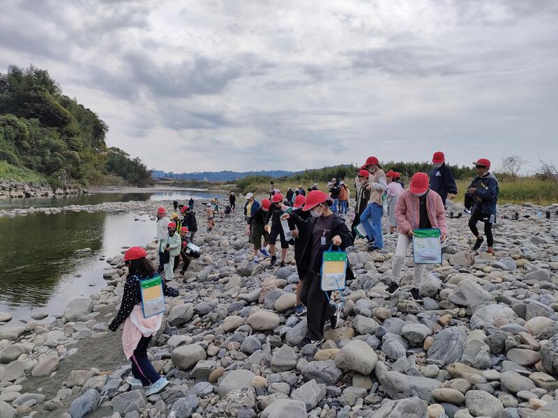 それから河原に移動し、石の大きさを調べたり、6年生で学習する地層について話を聞いたりしました。