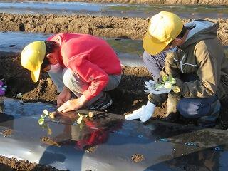 きれいに整備された畑に足跡をつけるのがもったいないなあと思いながら「大きくなあれ」と心を込めて植えました。