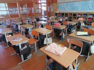 避難訓練がありました。もし地震が発生したら、どのような行動をとればよいかを考えました。教室では、机の下に入り、しっかりと机のあしをにぎりしめて頭を守る訓練ができました。