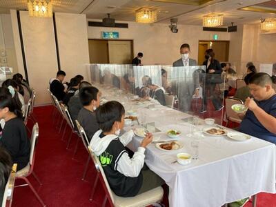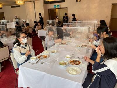 修学旅行最後の食事となる昼食をいただきました。ハンバーグと唐揚げをフォークとナイフを使っていただきました。