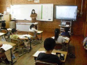 今日4年生と5年生は算数の学習がありました。4年生は2桁÷2桁の筆算の仕方を学ぶために、まず、電子黒板の絵図を使って視覚的に割り算をした後、この時間の「めあて」を自分たちで考え発表していました。5年生は紙を折った回数と長方形の数の関係について表にまとめた後、長方形の数が2・4・8・16と2倍になって増えているという決まりを見つけていました。順に増える数を表を使って調べる5年生でした。