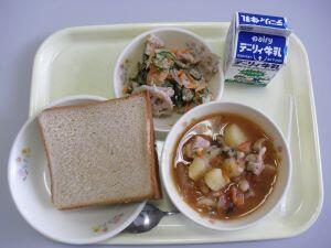 今日の給食の献立は、【黒糖しょくパン・まめと鶏肉のトマト煮・れんこんごまサラダ】でした。食材のにんじん・たまねぎ・しめじ・じゃがいも、きゅうりは、全て「ふるさと綾産」です。そして今日は『カミカミ献立』でよくかんで食べることのできる食材が選んで調理されています。よくかんで食べると唾液が出て消化吸収がよくなり食べ物の味がよくわかります。そして、かむことによって脳を刺激することができ、あごや歯を丈夫にしてくれます。栄養のバランスだけでなく、脳やあご・歯の働きまで考えたおいしい給食ありがとうございます。