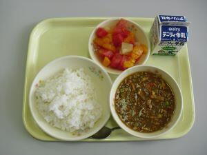 1学期最後の給食!!【ごはん・キーマカレー・フルーツジュレ】