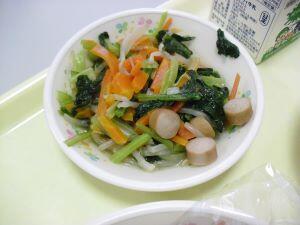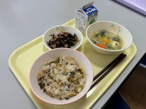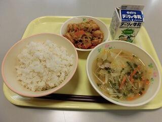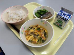 今日の献立は【チキンライス・野菜スープ・サツマイモのサラダ】でした。今回は、給食時間の放送原稿を紹介します。『今日は、いつものポテトサラダのじゃがいもを、サツマイモで作ったサツマイモサラダです。綾でできたサツマイモを使っています。ほんのり甘いサツマイモを野菜やハムと一緒にマヨネーズで和えました。味わっていただきましょう。』サツマイモの生産者の方は、久木野地区の郡さんでした。その他、米は揚町地区のJA綾町さん、小松菜は割付地区の福重さん、きゅうりは立町地区の森久保さんでした。今日も美味しい食材・美味しい調理ありがとうございました。