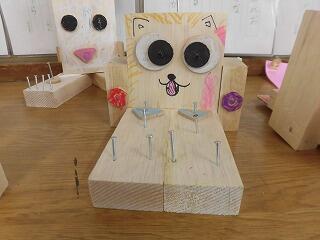 丸や星形など決まった板のパーツを組み合わせて形にしていきますが、どこに釘を打つかも一人一人違っており、思い思いの作品ができました。とてもかわいらしいですね。