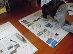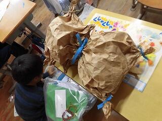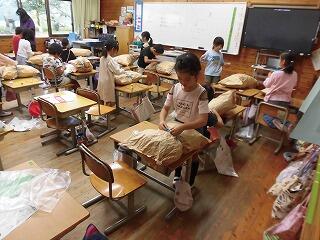 くしゃくしゃに丸めた新聞紙を茶色の袋に入れ、ぎゅっと青いひもで結んで形を作っていきます。