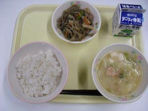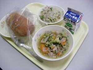 今日の献立は【食パン・マーシャルビーンズ・豆乳クリームシチュー・フルーツカクテル】で【あやっ子読書週間】に合わせた、「おはなし給食」のメニューでした。『じゃがじゃがおなべのおふろやさん』とう絵本の「クリームシチューのお風呂」を参考にした献立で、ウインナー・じゃがいも・ブロッコリー・しめじなどが仲良くお風呂につかってるイメージです。しめじの生産者は、綾町古谷地区の宮崎産業さんでした。おはなし給食とふるさと綾産食材のコラボでもあります。今日も美味しい給食ありがとうございました。