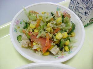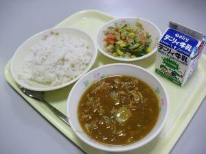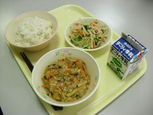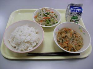 今日の献立は【ポークカレー・りっちゃんサラダ】でした。読書週間に合わせて、「サラダでげんき」の絵本にでてくる【りっちゃんサラダ】がメニューでした。【りっちゃんサラダ】は、キャベツ・きゅうり・にんじん・コーン・トマト・ハム・昆布・鰹節の入ったとても美味しい味付けのサラダで、ポークカレーのポークは「綾ぶどう豚」でした。とても美味しかったです。今日も美味しい給食ありがとうございました。