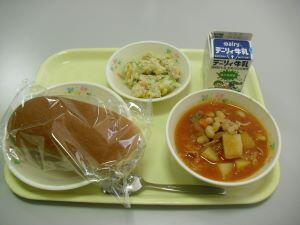 今日の献立は【黒糖パン・ポークビーンズ・マカロニサラダ】でした。ポークビーンズのケチャップ味とマカロニサラダのマヨネーズ味は、黒糖パンととても相性が良く美味しかったです。それでは本日の綾町食材の生産者の方々を紹介します。にんじんが杢道地区の爰野さん、キャベツが揚町地区の西郷さん、きゅうりが昭和地区の川崎さんでした。今日も新鮮で美味しい食材・美味しい調理ありがとうございました。