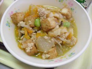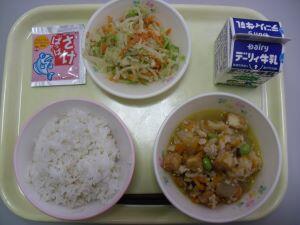 今日の献立は【麦ご飯・ふりかけ・冬瓜のそぼろ煮・千草和え】でした。今回は給食時間の放送内容を紹介します。【「冬瓜の話です。冬瓜は冬の瓜と書きますが、れっきとした夏の野菜です。これは、冬まで保存できることから「冬瓜」という名前がつきました。冬瓜はビタミンB1、ビタミンB2、Cなどをわずかに含んでいますが、ほとんど水分です。昔から体を冷やし、暑さでほてった熱をとってくれるとされ、暑気払いの食べ物でした。しっかり食べて、水分補給しましょう。】この時期の暑さを考えたメニュー本当にありがたいです。今日も美味しくて栄養満点の給食に感謝・感謝です。