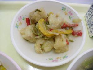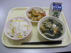 今日の献立は【コーンご飯・かきたま汁・魚のレモン煮】でした。コーンご飯とかきたま汁、そして、レモン煮との組み合わせは、ご馳走感たっぷりで美味しく大満足でした。今日も美味しい給食ありがとうございます。それでは、本日の綾町食材の生産者の方々を紹介します。小松菜が割付地区の福重さん、白ネギが竹野地区の坂田さん、えのきたけが古屋地区の宮崎産業さん、ジャガイモが杢道地区の森山さん、きゅうりが四枝地区の清水さん、ピーマンが四枝地区の長池さんでした。今日も美味しい食材・美味しい調理ありがとうございました。
