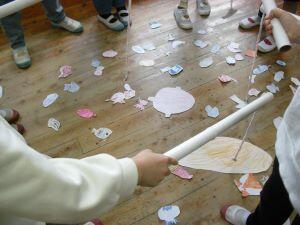 本日19日、2年生が1年生を招待して一緒に遊ぶ「おもちゃ祭り」が行われました。1年生は楽しそうに、おもちゃを作ったり、作ったおもちゃで遊んだりしていました。そして、2年生が1年生に優しく作り方や遊び方を教える姿がありました。とても微笑ましい1年生2年生のおもちゃ祭りでした。