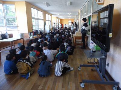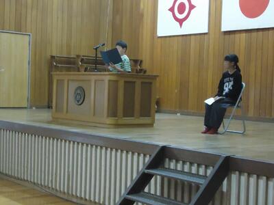 1年生児童2名が作文発表をした後、校長先生の話では次の学年に向けての心構えと絵本「くまのこうちょうせんせい」をもとに命の大切さを伝えました。
