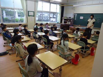写真は、先生の話を姿勢正しく聞いている1年生の様子です。
